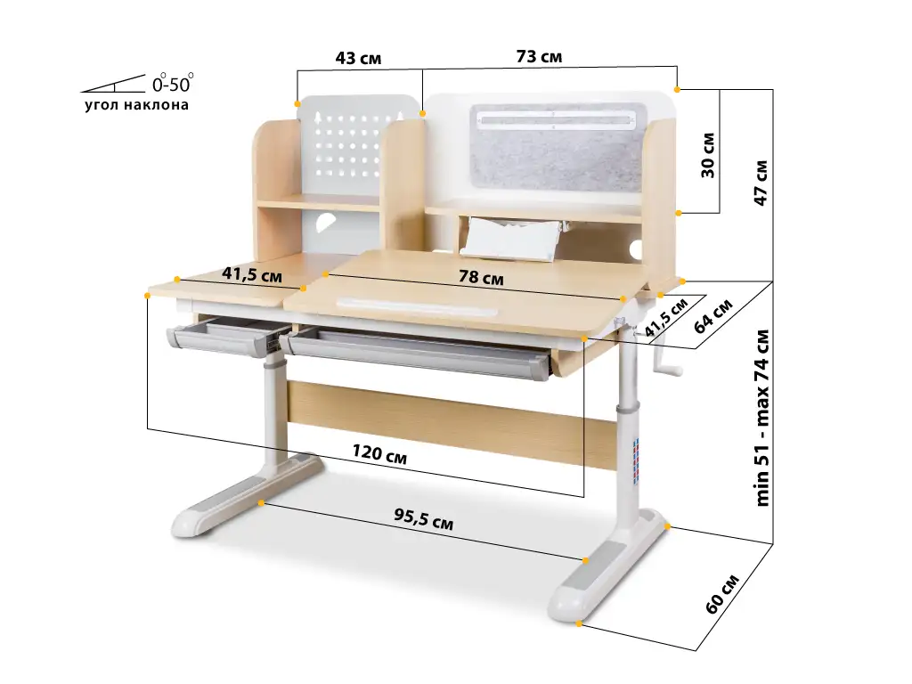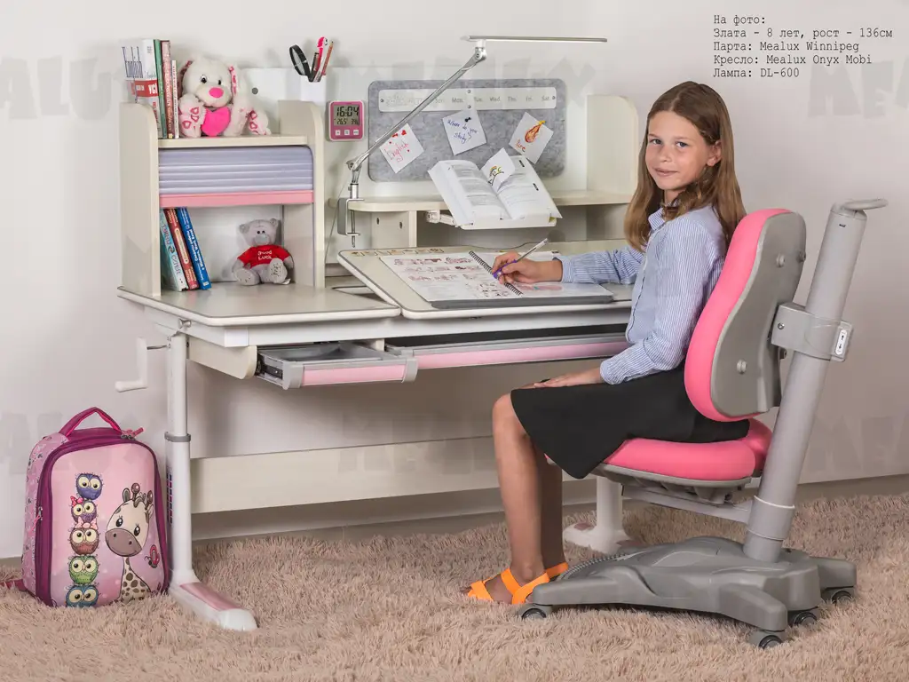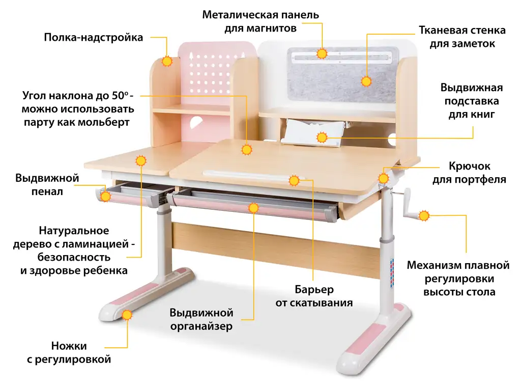 з полицею-надбудовою, висувна підставка для книг, з гачком для портфеля, ручка регулювання, пенал, ніжки з регулюванням, металева стінка для магнітів