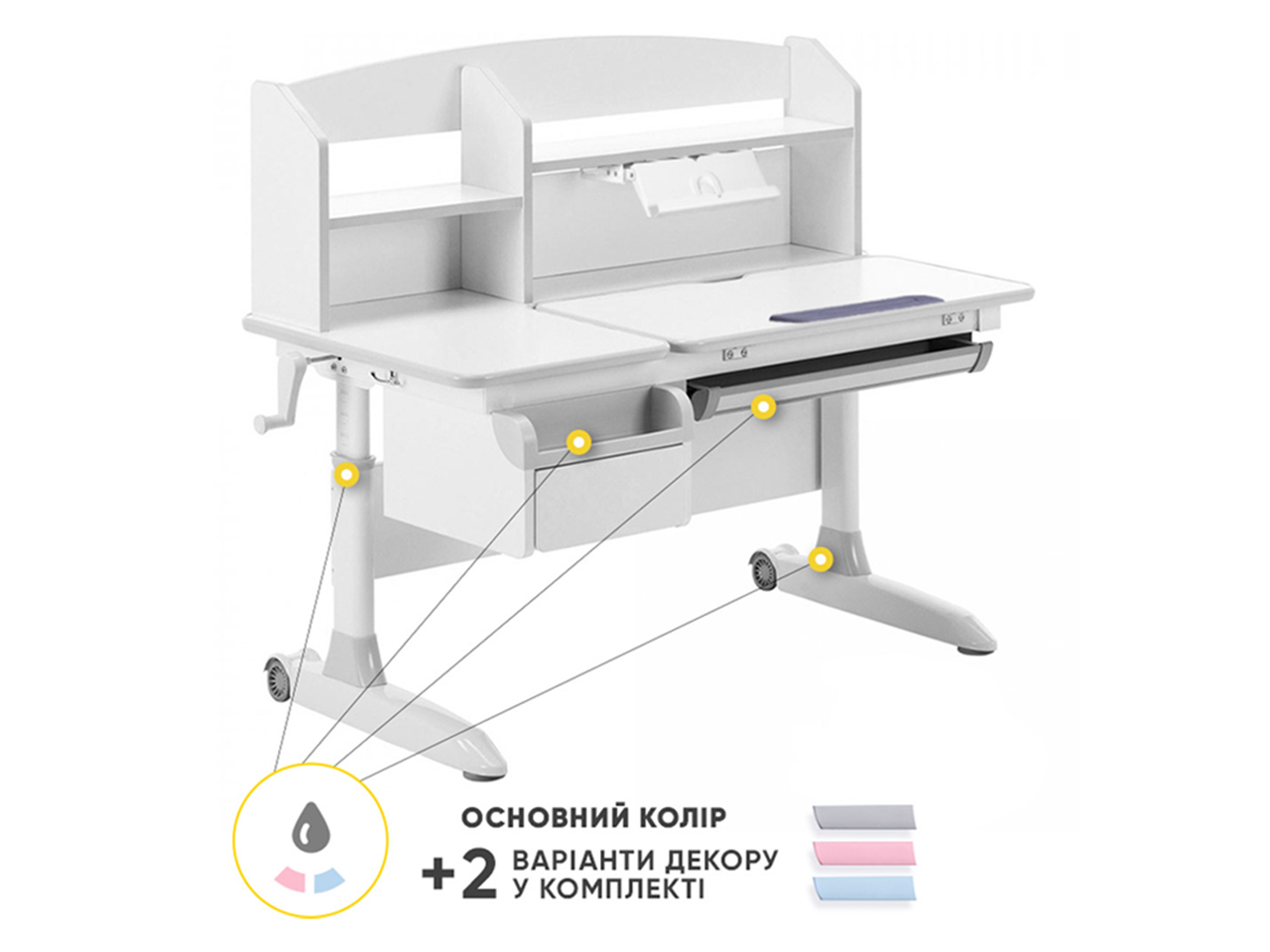 з полицею-надбудовою, з гачком для портфеля, пенал, ніжки з регулюванням
