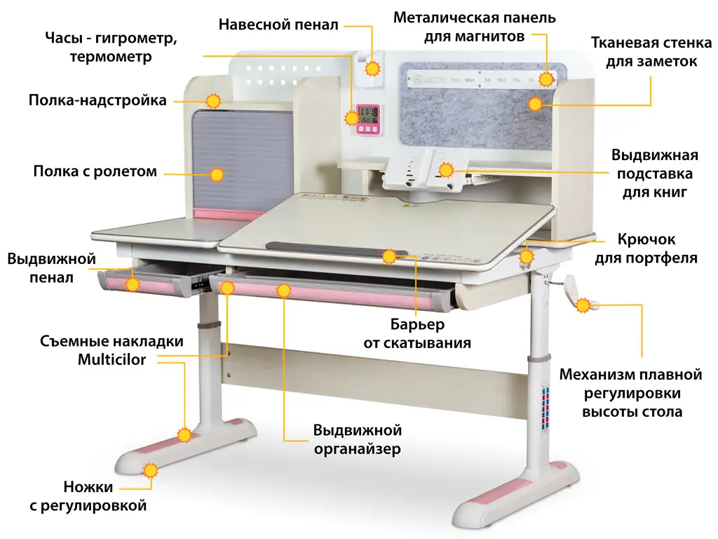 с полкой-надстройкой, выдвижная подставка для книг, с крючком для портфеля, ручка регулировки, пенал, ножки с регулировкой, металическая стенка для магнитов
