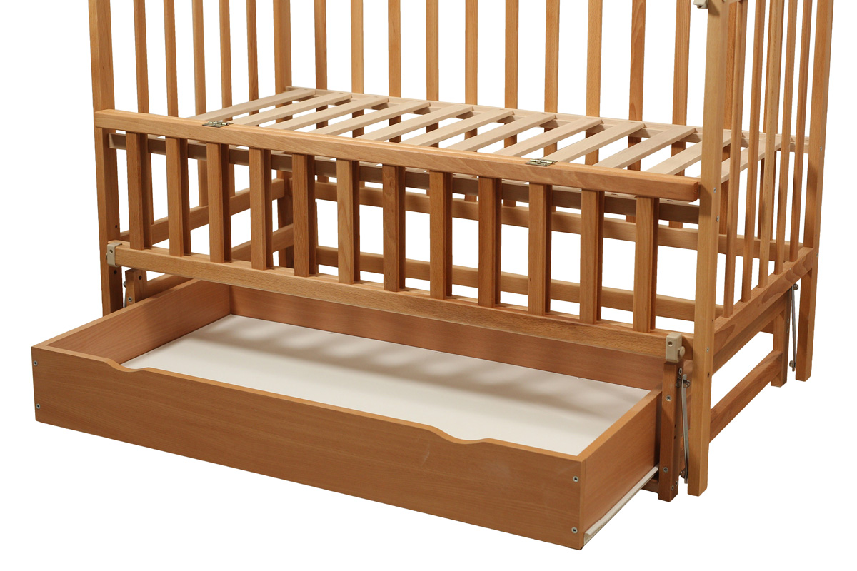 Материалы: Кроватка изготовлена из натурального бука, что гарантирует долговечность и экологичность. Для отделки использована безопасная водная краска, не вызывающая аллергии.